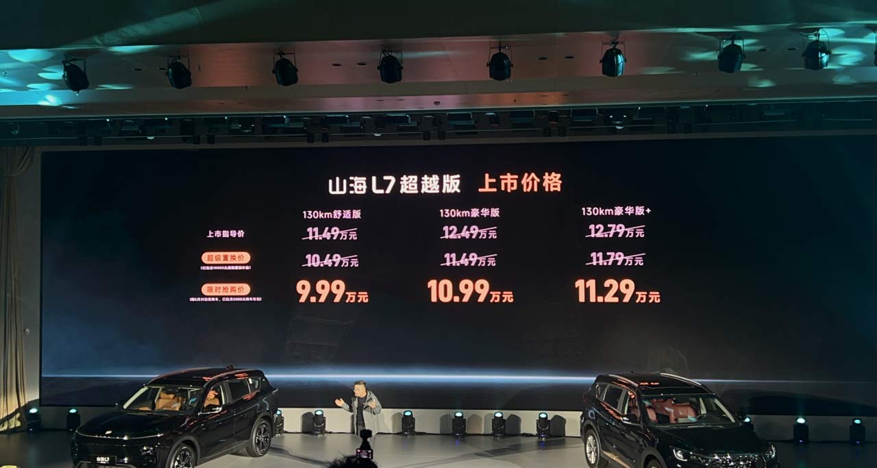 2026款捷途山海L7超越版推出3款车型,指导价11.49万元-12.79万元,上市期间送上4重购车礼遇,限时抢购价9.99万元-11.29万元。