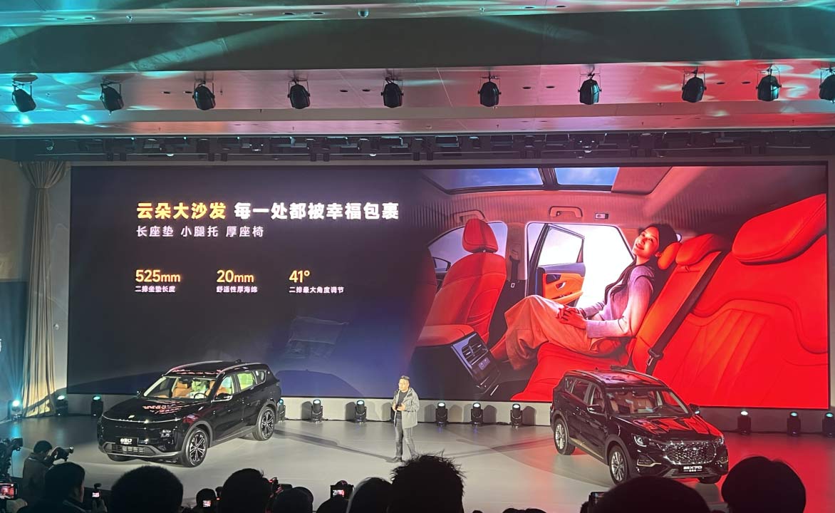 该车具备1900mm宽体车身与2745mm轴距,带来大7座布局;支持5/7座随心切换、12种座椅组合,适配各类生活场景;第二排腿部空间960mm,头部空间997mm;二排放倒车内容积可达1688L,配合云朵舒享大沙发,二排靠背25°-41°随心调节,以及可选装的-6℃~50℃智能冷暖冰箱,让每位家人坐得舒展、装得从容。