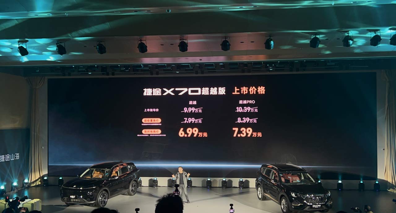 发布会现场,2026款捷途X70超越版的指导价及专属购车权益公布。2款车型指导价9.99万元-10.39万元,提供3重购车豪礼,限时抢购价6.99万元-7.39万元。