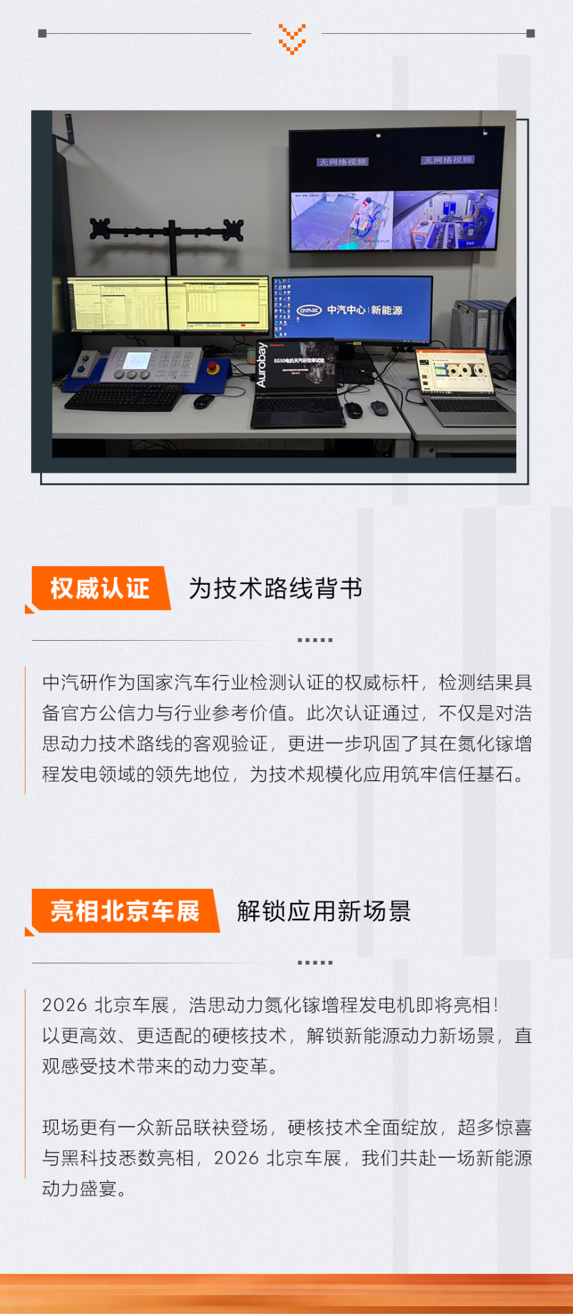 权威认可+全球首发!浩思动力氮化镓增程发电系统获中汽研认证,控制器效率99.79%、系统效率96.57%,将于2026北京车展首次展出。