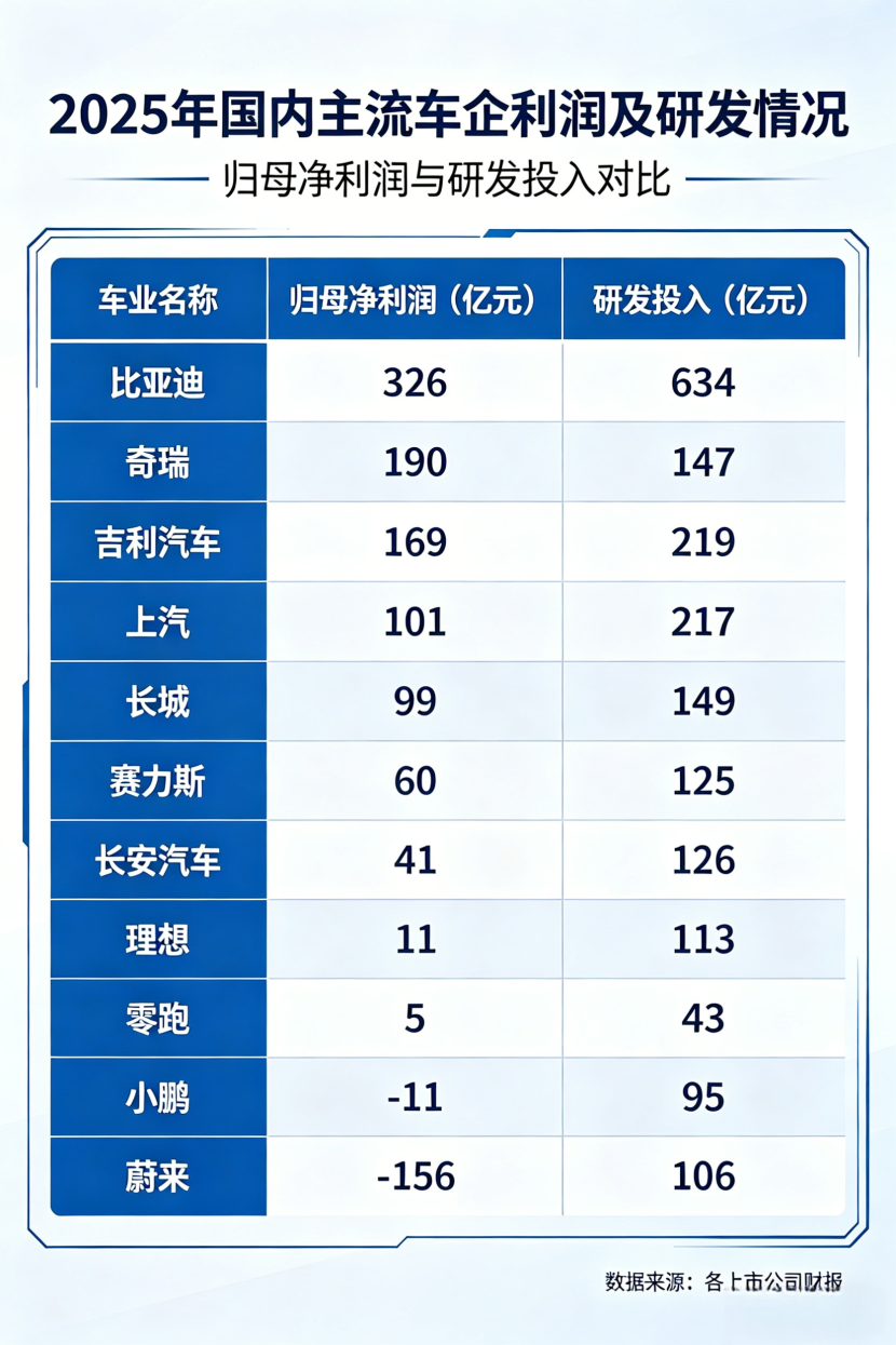 研发投入的差距,成为头部车企竞争力分化的“胜负手”。2025年,比亚迪研发投入达634亿元,同比增长17%;吉利、上汽、长城、奇瑞研发投入分别为219亿元、217亿元、149亿元、147亿元,分列第二至五位。值得注意的是,比亚迪一家的研发投入,已超过吉利、长城、奇瑞三家企业的研发投入之和。