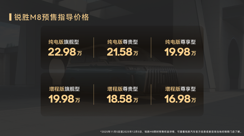 作为北京汽车制造厂孵化的独立MPV品牌,锐胜汽车持续深耕MPV细分市场,敏锐洞察用户未被满足的真实需求与市场空白。锐胜M8的推出,为用户提供了更全面的选择,进一步提升了出行的品质与体验。目前,锐胜M8预售已经开启,能否获得市场青睐,我们拭目以待!