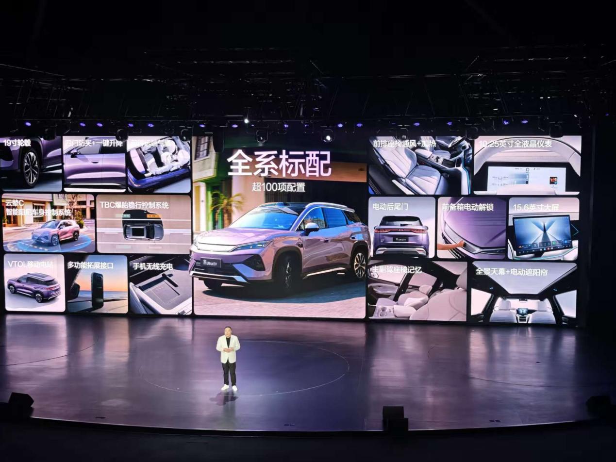 此外,宋Ultra EV全系标配超100项实用配置,包括第二代刀片电池及闪充技术、主副驾座椅记忆、带遮阳帘的全景天幕、电动后尾门、15.6寸大屏、前备箱电动解锁、前排远端气囊、螺纹接口等。